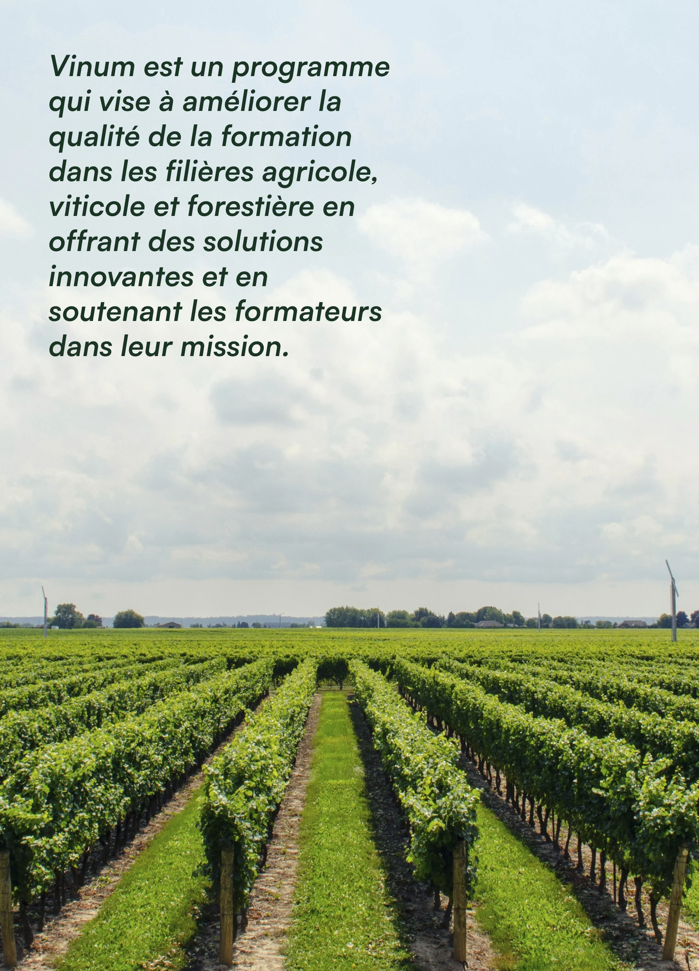 Vinum est un programme qui a pour objectif de fournir des services dans les filières agricole, viticole et forestière en créant des logiciels et des déploiements, en formant des formateurs et en offrant un support pour la formation.